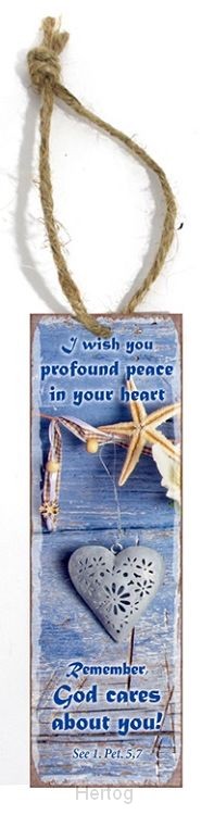 - Metalen boekenlegger met de tekst: I wish you profound peace in your heart. Remember, God cares about you! - See 1. Pet. 5,7