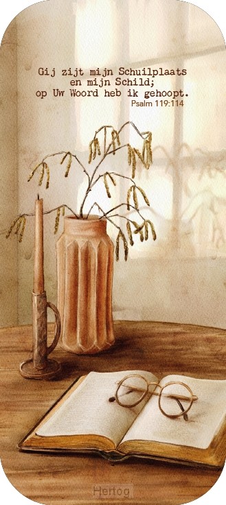- Op de boekenlegger staat de tekst uit Psalm 23:1: De HEERE is mijn herder mij ontbreekt niets.